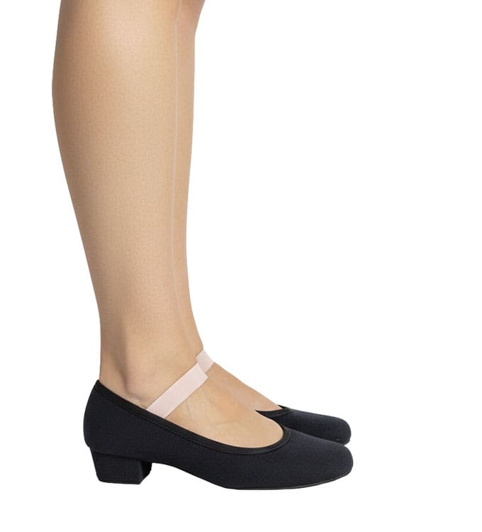 Sapato “Character Exame Royal” é ideal para exames de dança. Possui salto de 3,5 cm, é feito em lona resistente e conta com um elástico rosa delicado sobre o peito do pé para maior ajuste e conforto.